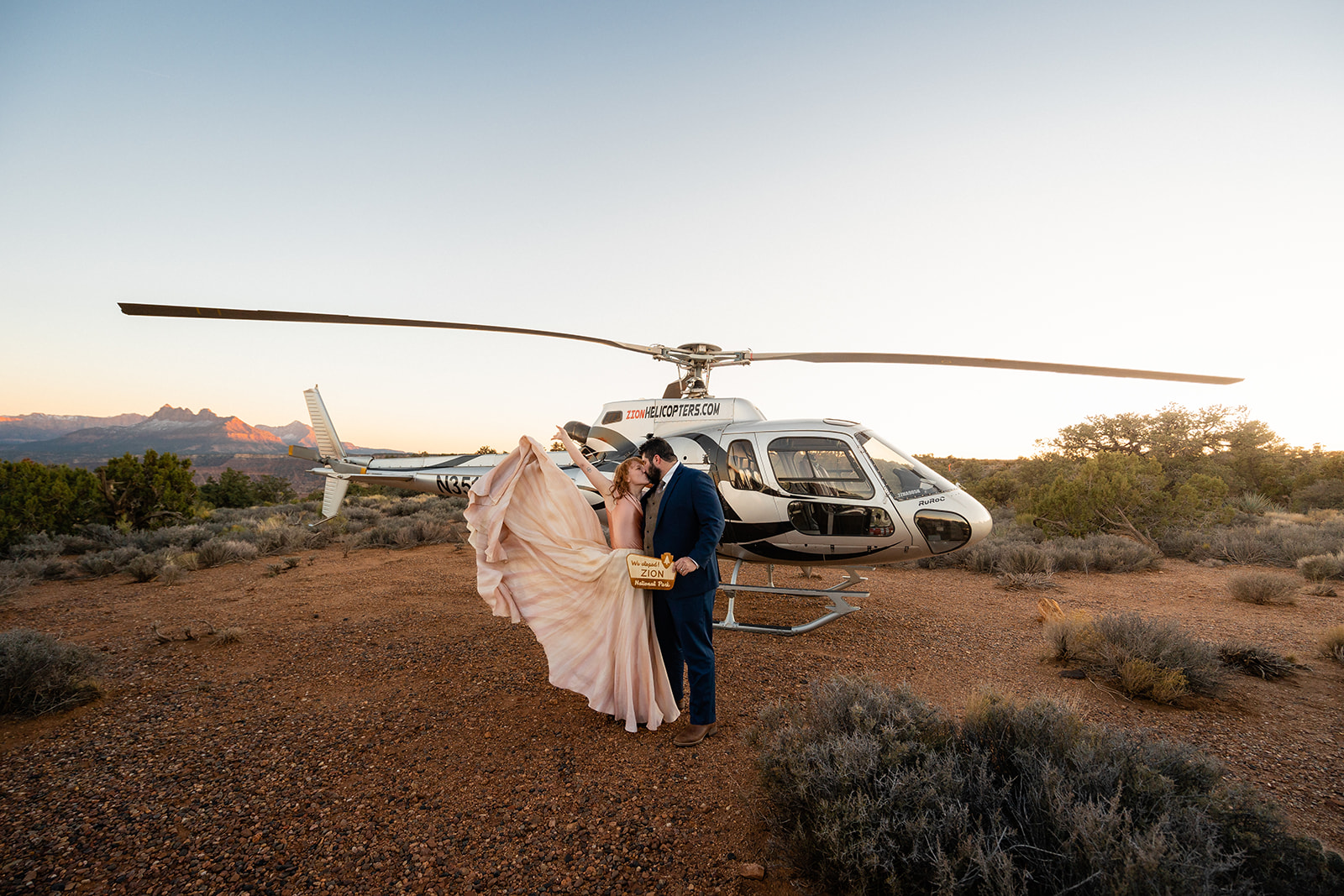 Let’s be honest, Zion wedding photography isn’t just for the couple. It’s also for your future selves, five, ten, twenty years from now, when you want to remember how the cliffs looked at sunset or how your dress caught the breeze on that narrow ridge. The dramatic light, the massive scale, the textures of the rock, the wildness of the place… it all photographs like a dream. Whether you’re posing on the edge of a canyon or getting caught in a dust storm that turns into a rainbow (yes, it happens), there’s a kind of cinematic quality to Zion photography that you just can’t replicate anywhere else. Most photographers in the area offer adventure sessions, meaning you can hike, explore, or fly while documenting the whole experience. And for those who want aerial shots? Zion helicopter wedding packages often include professional photography both inside the aircraft and out in the wild, so you don’t have to choose between epic landscapes and intimate moments, you get both.